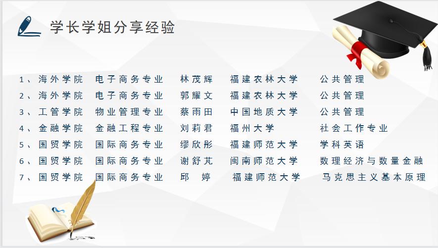 各个学院的学长学姐结合自身所报专业情况分别从择校经验、各科经验分享、考研心态调整等方面,分享了各自在备考期间学习生活的经验与所得。学长学姐们为同学们指出了数学、英语、政治、专业课等学科考察的重难点,详细介绍了不同学科的备考周期与复习建议、向同学们推荐了丰富的配套备考教材与资源,呼吁同学们根据学科和复习阶段的不同,采取不同的复习方式方法,提高考研备考效率。