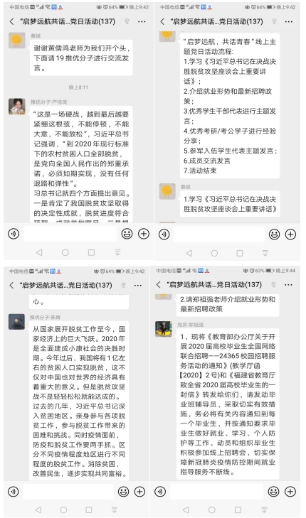 活动围绕学习《习近平总书记在决战决胜脱贫攻坚座谈会上重要讲话》精神让大家进一步掌握脱贫攻坚的相关知识,了解疫情防控时期就业形式和最新招聘政策,帮助同学们科学合理制定未来规划,提高青年学子的政治敏感度,把握国家大政方针政策支部党员教师就疫情期间的就业形势和最新招聘政策作了详细讲解与会成员还针对脱贫攻坚战的相关话题展开了激烈讨论,各抒己见学生干部代表、优秀考研考公学生代表、参军入伍学生代表分别就各自成功经验做了分享。