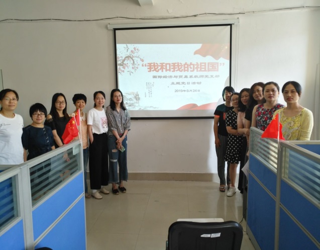 2019年9月24日,在新中国成立70周年之际,国际经济与贸易系教师党支部组织支部全体党员在马尾校区开展“我和我的祖国”主题党日活动,为祖国庆生日,向祖国献祝福。主题活动激励教师党员把爱国情、报国志融入到学院事业高质量发展中来。