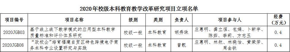 日前,beat365官网申报的《基于线上线下教学模式的应用型本科教学质量标准和评价体系研究》(项目负责人:胡秀珠)、《“政校企”培育福建自贸区特色跨境电子商务本科专业设置研究与实践》(项目负责人:曾靓)两个项目获批立项2020年校级本科教育教学改革研究项目。