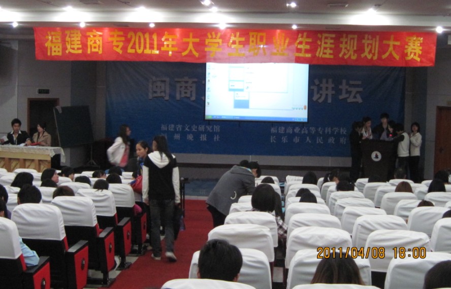 2011年4月818:00,由我校就业指导中心主办的福建商专2011年大学生职业生涯规划设计大赛在校演播厅拉开战火。本次大赛校领导给予了大力的支持:吴贵明副校长、黄跃舟副书记、张杰主任、张信容处长、林丹主任担任了本次大赛的评委。