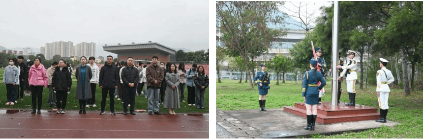 上午7点10分,升旗仪式正式开始,护旗手们身着戎装,脚步铿锵,步入国旗台中,伴随嘹亮国歌,升起五星红旗,全体师生庄严肃立,向国旗行注目礼。