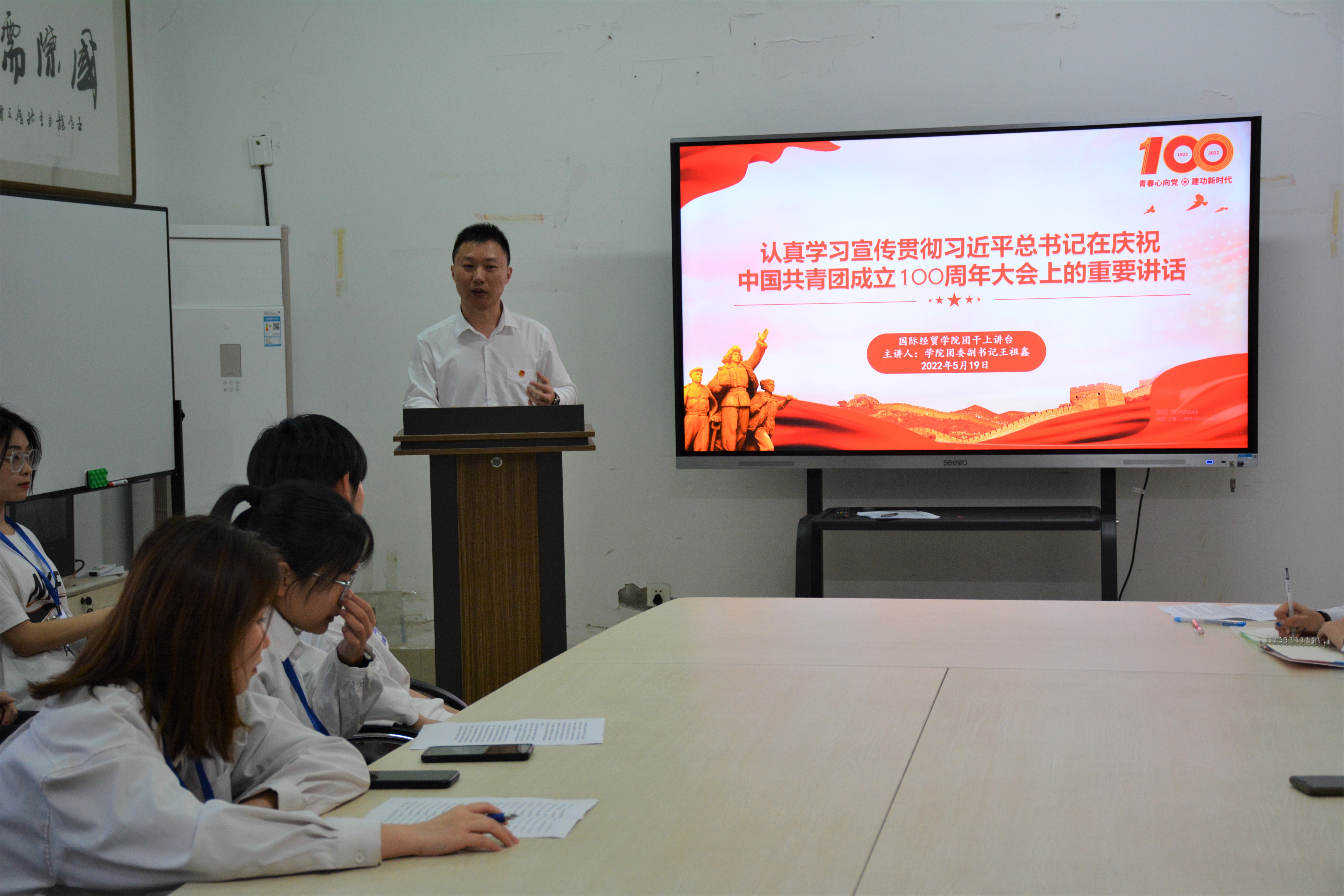 为进一步深入学习宣传贯彻习近平总书记在庆祝中国共产主义青年团成立100周年大会上的重要讲话精神,5月19日,beat365中文官方网站团委开展“团干部上讲台”活动,学院团委副书记王祖鑫对习近平总书记在庆祝中国共产主义青年团成立100周年大会上的重要讲话进行领学。