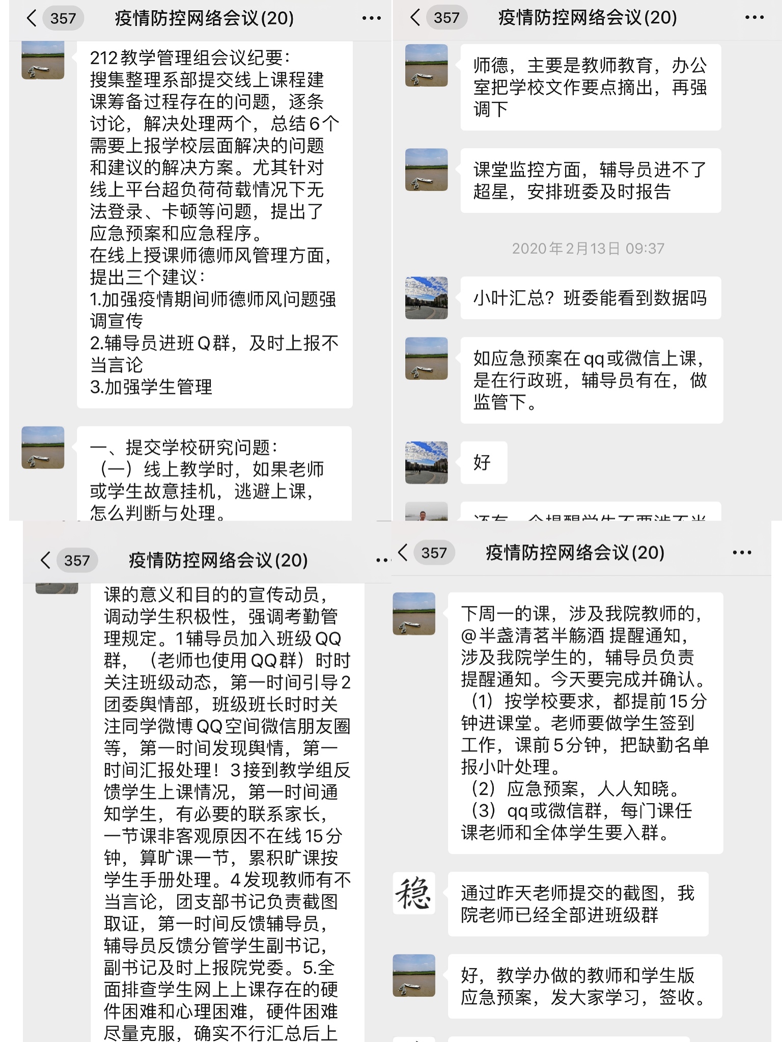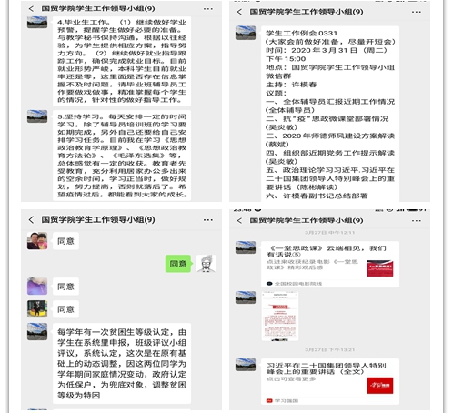 学院党政领导班子密切关注学生工作防疫情况,通过微信群准确掌握每日学生健康史、旅居史和接触史的异常情况,以及对学生的日常管理工作给予精准指导。学院党委书记曹晓霞靠前指挥,积极发声,亲自主持2次学生工作例会,准确研判、全面部署学生日常管理工作和疫情期间的思想政治教育工作,学院党委副书记、院长庄惠明、副院长江剑敏多次参与学生工作例会,充分了解学生线上学习状况,及时解决学生线上学习的种种困难,并要求辅导员加强对学生线上学习的考勤管理,保证疫情期间学风建设仍不停歇;分管学生工作的党委副书记许模春坚决扛起责任,通过线上形式召开9次学生工作领导小组会议,提出建立“辅导员队伍、团学干部、班委”三位一体的工作队伍,要求做到各司其职,群策群力,确保疫情防控工作做真做实做细,确保全覆盖不留死角,并多次强调疫情期间做好团学工作的重要性和紧迫性,要以疫情为生动教材,探索思政育人新模式,做到“疫情防控”、“学生工作”两手抓两促进,有力落实立德树人的根本任务。
