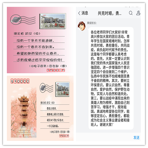 党旗所指,就是团旗所向。疫情期间,beat365中文官方网站团委始终坚持服从党委号召,切实做好党的助手和后备军,充分发挥团组织是党联系学生青年的桥梁和纽带作用,以团支部为主要抓手,以团日活动和主题班会为载体,加强30个团支部的联系交流,动员全体约50名共青团干部全程参与协助,充分发挥广大团员的“主力军”作用,筑牢防疫防控的青春战线。第一时间下发《beat365中文官方网站团委关于做好新型冠状病毒防控工作的倡议书》,倡议全院青年团员积极响应组织的号召,积极行动,充分发挥作用,科学对待疫情,做好自我防护工作,积极配合排查,合理安排假期,努力提升自身综合素质;认真组织各团支部有序开展“共克时艰·勇担使命”线上主题团日活动,为进一步推进学校疫情防控工作,增强团组织的战斗力,校黄斌校长深入班级,“走进”所联系的18级电子商务1班,与学院党委领导班子共同参加线上主题团日活动,黄斌校长对团日活动给予充分肯定,并希望同学们认识到我们党的伟大国家强大和人民坚强,树立环保意识,尊重和保护自然,实现人与自然和谐共处,以及要以战疫中涌现出来的英雄人物为榜样,激励自己刻苦学习,增强才干,努力成为社会主义事业建设者和接班人。