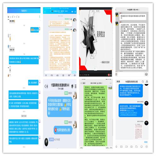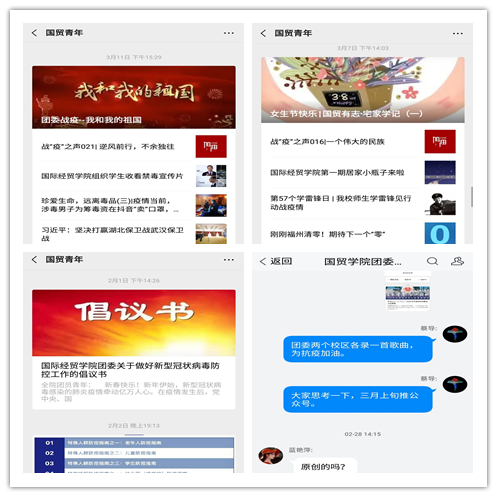 勇于担当,做好学生的“思想引领者”。全体辅导员充分认识做好疫情防控工作的责任感和紧迫感,坚持把学生的生命安全放在第一位。通过参加网络专题培训,专题学习分享会、学习强国APP、高校思政网等公众号努力学习理论知识和育人方法,切实把疫情防控工作融入学生思想政治教育中,围绕爱国主义、规则意识、感恩教育等主题,精心打造线上“微思政课堂”;组织全体学生观看由教育部社会科学司指导,中教华影全国校园电影院线拍摄的巡礼影片《一堂思政课》,全国校园电影院线公众号选登卢陈淑琪等5位学生观后感,彰显了网络育人的显著成效;面对网络上铺天盖地的疫情信息,辅导员们及时通过QQ群、微信群日均推送2-3条对相关政策措施的宣传解读,教育引导学生正确认识、理性看待、科学应对疫情,讲清防控知识、防控方法、防控要求,对网上恶意传播、扭曲疫情信息,积极发声,及时辟谣,并积极传递“抗疫”典型事迹、优秀榜样进行示范教育,培养学生的爱国情怀与理想信念,督促学生珍惜时光、刻苦学习、练就过硬本领,用青春梦想和实际行动贡献力量;