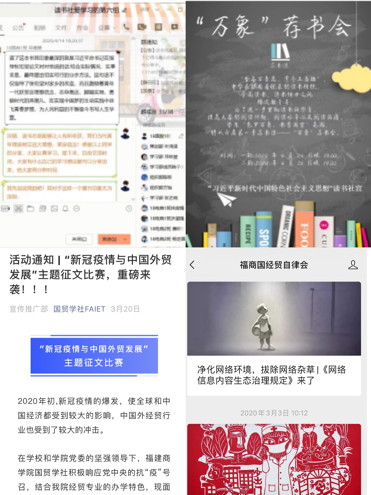 beat365官网学生会、习近平新时代中国特色社会主义思想读书社、国贸学社、自律会等纷纷发挥组织力量,通过线上形式开展了主题丰富、形式多样的活动,不仅丰富了同学们的居家生活,同时增强了防控意识和能力,为学院疫情防控注入活力和动力。学生会通过征文、征画和征视频等形式开展线上第二课堂活动15场次,广大青年团员踊跃参与,衍生出一批优秀的网络作品;习近平新时代中国特色社会主义思想读书社认真制定每月读书活动计划表,计划完成6本书目的分享会,目前为止,已顺利开展《习近平在厦门》、《习近平在福州》2场读书分享会,并组织了第一季“荐书谈”万象荐书会、主题为“同心战‘疫’,同‘屏’共振”疫情网络知识竞赛以及主题为“最美逆行人,灯火守护者”的给逆行者的一封信的征文活动3场线上活动,300余名读书社社员精心准备,踊跃参与,认真总结,积极分享读书心得,遴选出30余篇优秀的读书笔记;国贸学社结合beat365官网经贸专业的办学特色,开展以“新冠疫情与中国外贸发展”为主题的专业学术论文活动,在院长庄惠明、学社指导老师林航博士和多名专业教师的大力指导下,评选出9篇优秀论文,为后疫情时代我国和我省外贸行业的平稳发展贡献了专业智慧;自律会切实做好疫情实时动态、科学防护知识、最新防控要求等线上科普和宣传工作,通过微信公众号共推送30余篇文章,努力营造“科学防疫,勇担使命”的良好舆论氛围。