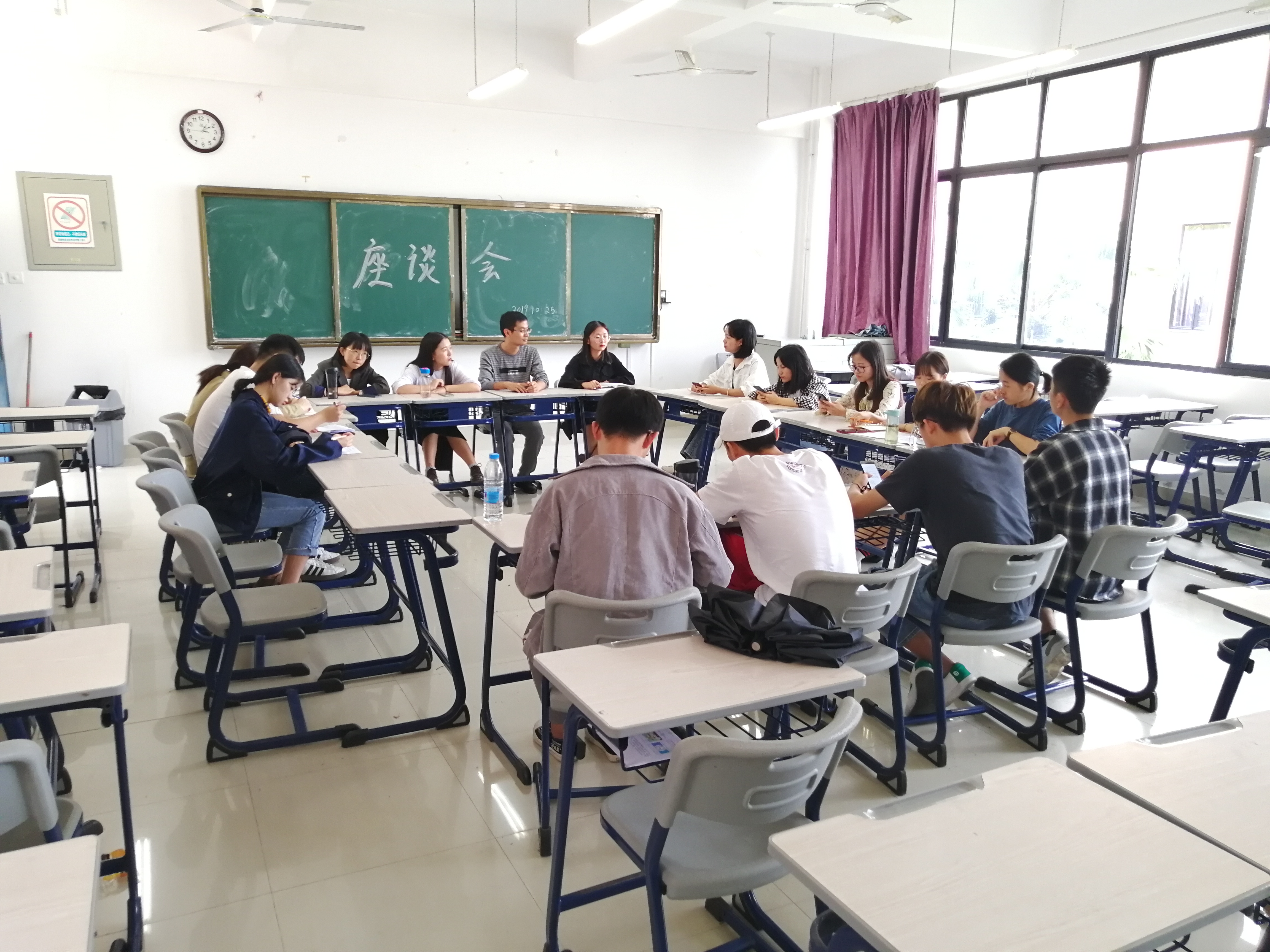10月25日,团委副书记蔡斌主持连江校区团委学生会干部座谈会。座谈会围绕接受的政治理论培训情况、自我学习的方式、内容、自我评价起模范带头作用的情况、自我评价政治理论素养情况、需要组织哪些方面的帮助等问题开展座谈。在听取了与会学生干部的发言后,蔡斌老师肯定了大家的政治理论素养,但也指出了存在的问题,希望大家加强学习,丰富学习形式,做好表率工作。
