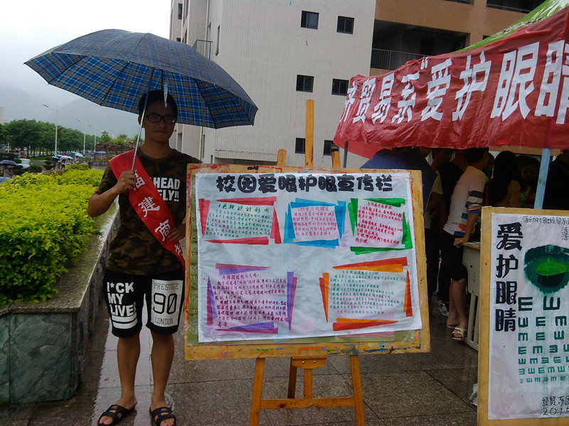 为了促进同学们对眼睛有关知识的了解,增强对用眼习惯的重视,已达到保护自己眼睛的目的,经济贸易系青年志愿者服务队于2015年6月5日在学校食堂门口办了护眼睛,守住光明的活动。