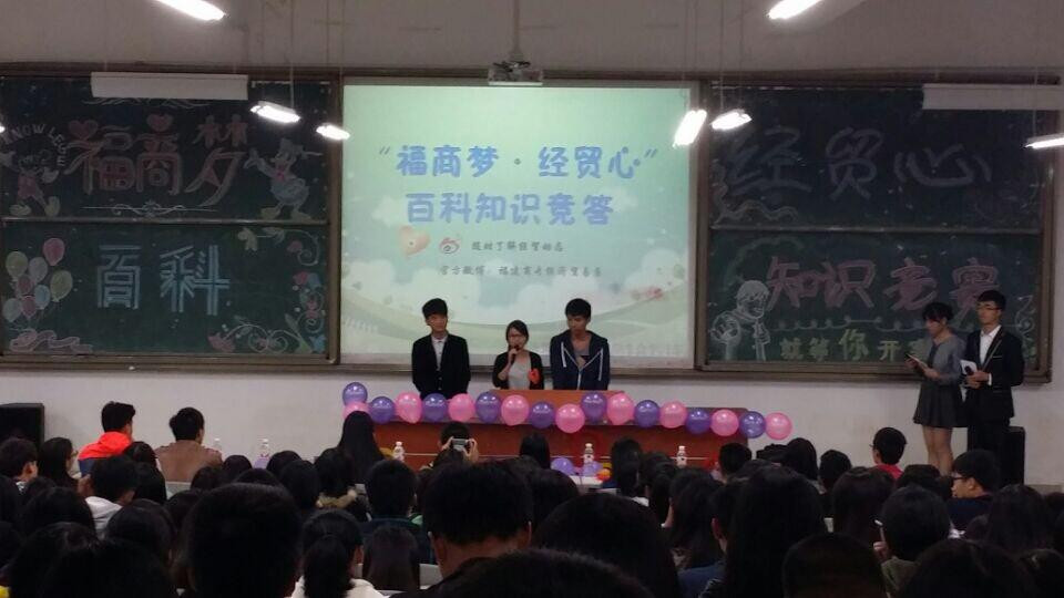2014119日,在我校潘渡校区在教学楼大阶教室一,经济贸易系举办了主题为“福商梦,经贸心”的百科知识竞赛,该知识竞赛旨在扩宽同学们的知识面,为同学们提供一个自我展示的平台。出席本次活动的成员主要有辅导员及经贸系各班的学生代表。
