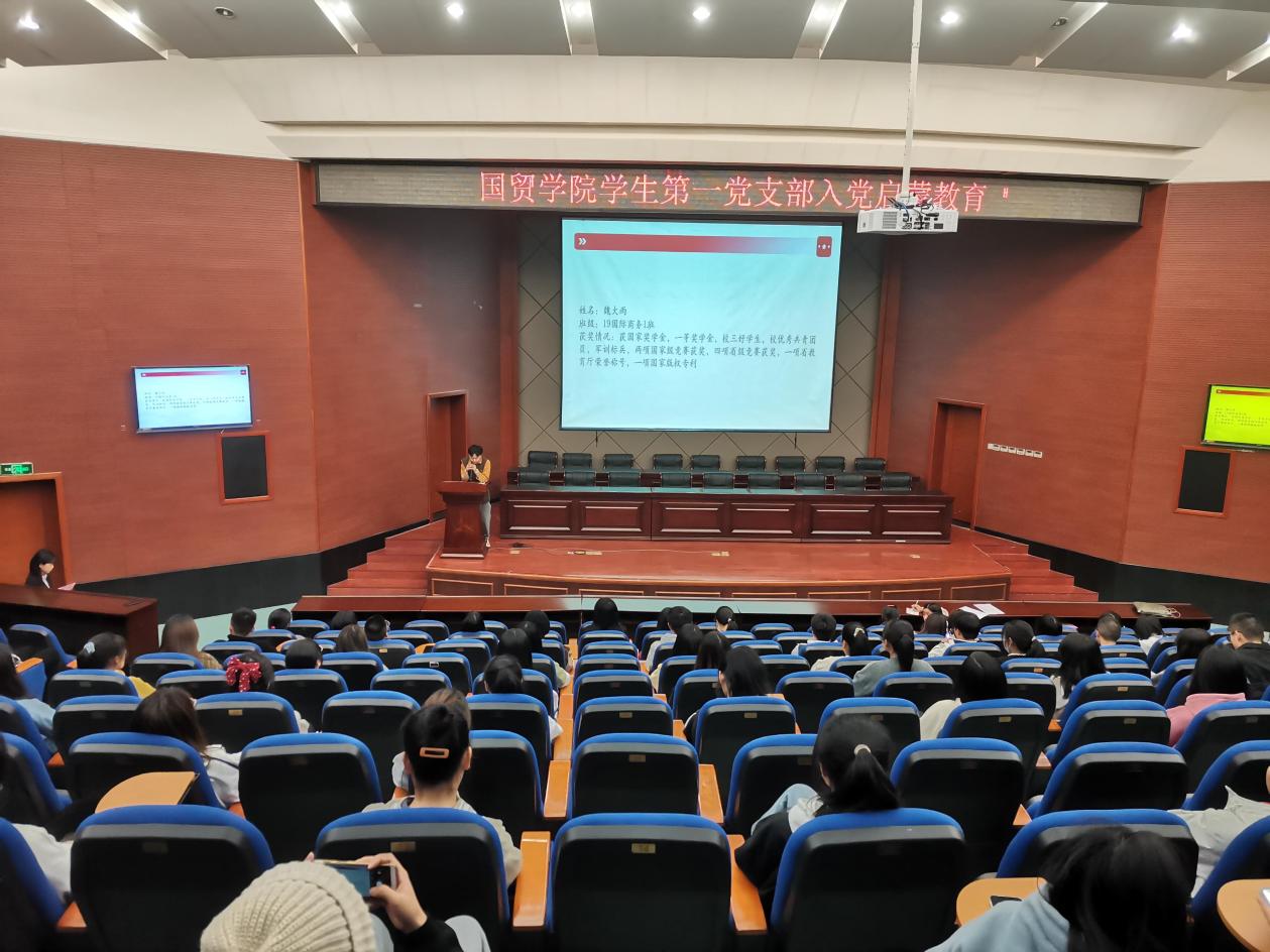 为学习贯彻落实中国共产党十九届六中全会重要精神,引导新生端正入党动机,积极向党组织靠拢,2021年11月25日,beat365中文官方网站学生第一党支部在学术报告厅举办“端正入党动机、坚定理想信念”新生入党教育活动。beat365中文官方网站学生第一党支部党员、2021级国际商务专业和跨境电子商务专业全体新生参加了此次活动。