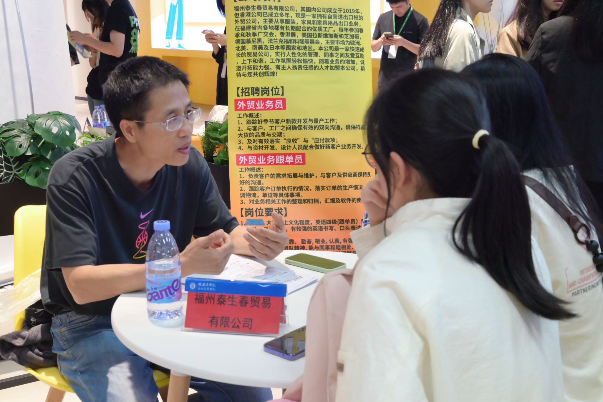 招聘会现场人头攒动,气氛热烈。参与招聘的企业涵盖了福州、厦漳泉、深圳、广州、武汉等多个区域。岗位需求涉及商务英语、国际经济与贸易、日语、跨境电子商务等多个专业领域。值得一提的是,本次招聘会不仅提供了传统的外贸业务员、市场业务、小中高教师等岗位,还特别推出了亚马逊跨境电商运营、朴朴新零售管培生、新媒体直播等新兴职业岗位。