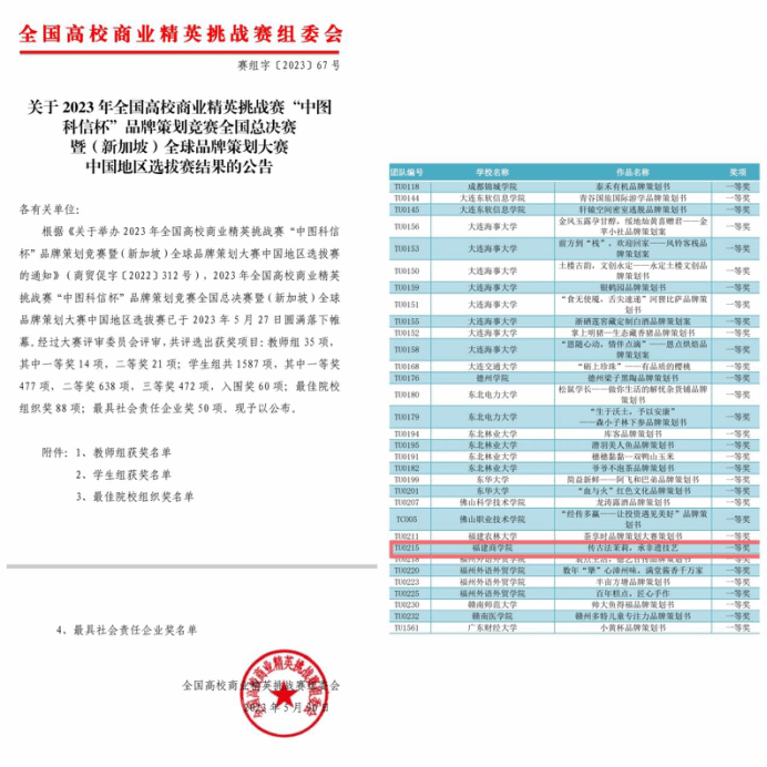 5月27日,由中国国际贸易促进委员会商业行业委员会、中国国际商会商业行业商会和中国商业经济学会主办,各省(自治区、直辖市)高校牵头承办的2023年全国高校商业精英挑战赛“中国科信杯”品牌策划竞赛全国总决赛在线上举办,经过层层选拔,共有1587支队伍入围全国总决赛学生组。大赛评选出一等奖477项,二等奖638项,三等奖472项。