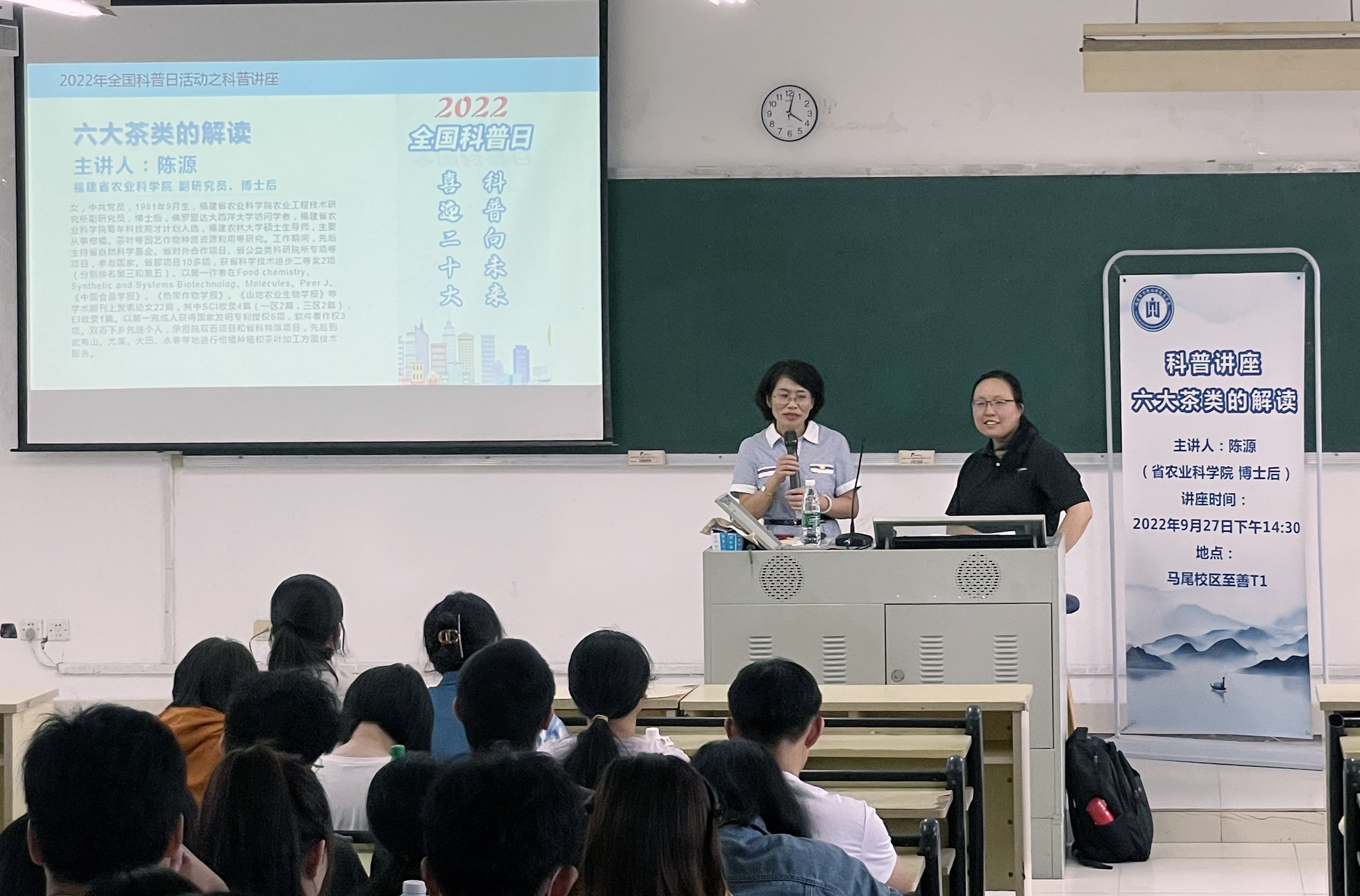 陈源副研究员用一张我国各类茶叶产量的变化图引出了本次讲座的主题——六大茶类的解读。她围绕茶叶的分类、各种茶类的历史演变与发展、茶叶分类的基础理论等五个方面展开演讲。讲解深入浅出、语言生动,给师生们带来了一场内涵丰富的科普盛宴。同学们听后都感到受益良多,将来可从各自专业的角度为福建茶文化传播和茶产业发展尽一份力。