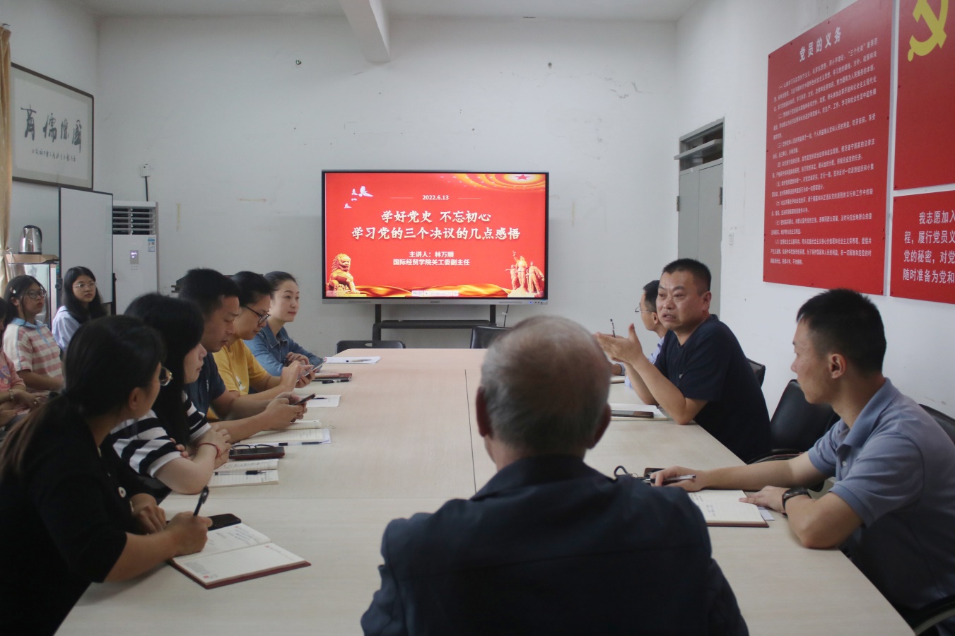 在加强党史学习教育常态化长效化方面,林万顺老师给全体思政工作人员及学生代表上了一场以《学好党史 不忘初心——学习党的三个历史决议的几点感悟》为主题的讲座,深刻阐释了党的性质、指导思想和宗旨,详细解读了党的光辉历程和历史经验,全面介绍了党百年来所取得的伟大成就,强调了三个历史决议的意义和作用。同时,他结合自身丰富的人生经历,提出“为什么入党”这一关键性问题,鼓励青年学生学好党史坚定理想信念,还自述“自递交入党申请书开始,便准备将自己的一生奉献给党和人民”,激励青年学生提高思想觉悟。