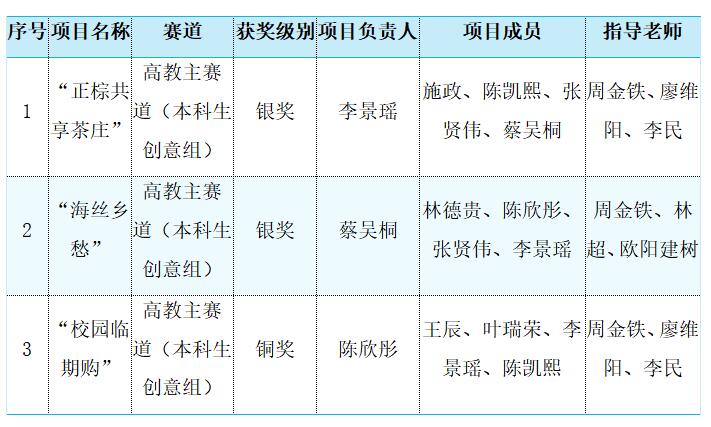 beat365官网参赛项目“正棕共享茶庄”、“海丝乡愁”获得高教主赛道省赛银奖”,“校园临期购”项目获得高教主赛道省赛铜奖。