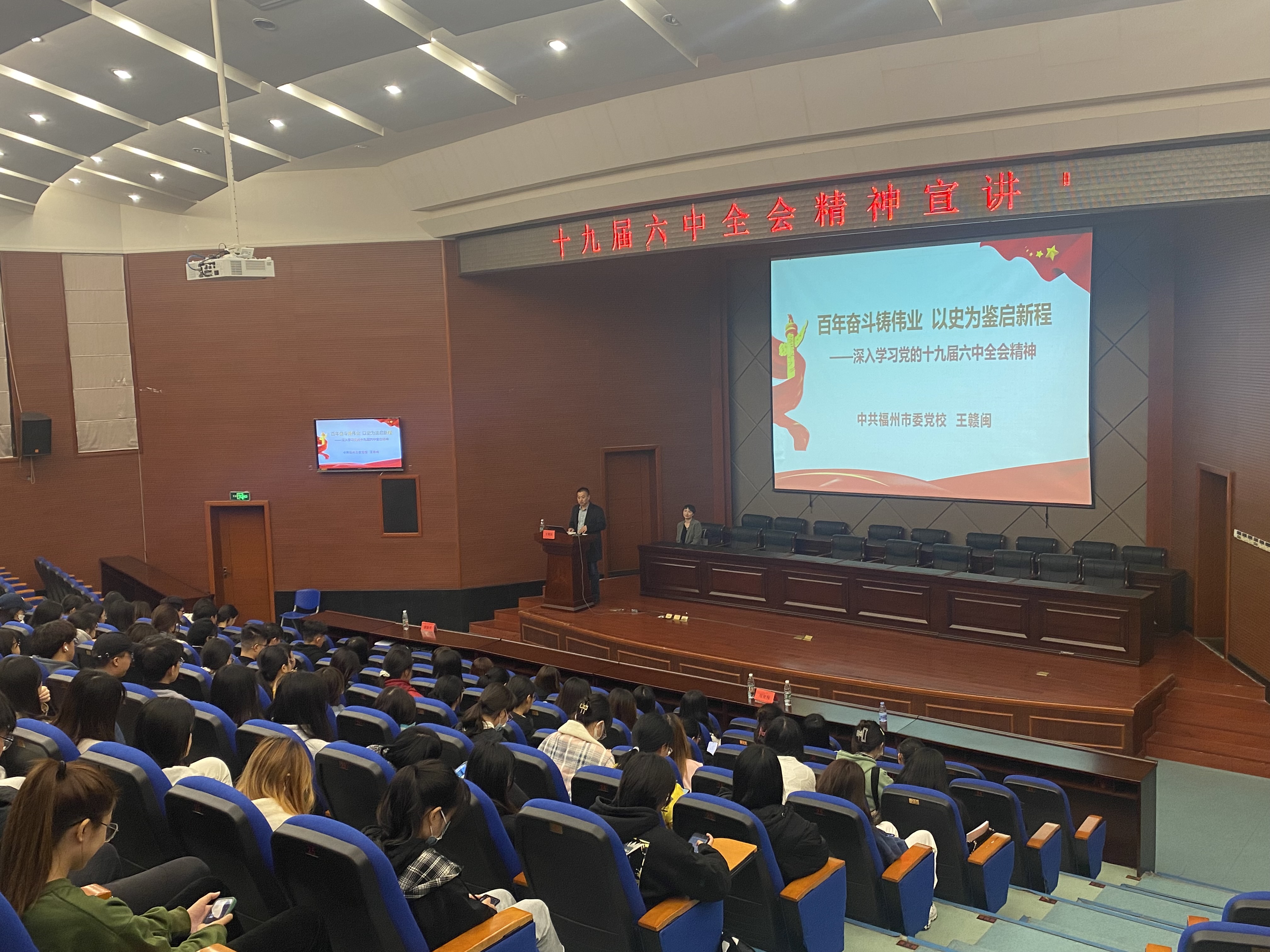 12月9日,beat365中文官方网站习近平新时代中国特色社会主义思想读书社在学术报告厅举办党的十九届六中全会精神宣讲会,福州市委党校副教授王赣闽应邀作专题辅导讲座。学院党组织负责人、读书社指导老师、读书社全体成员参加宣讲会。