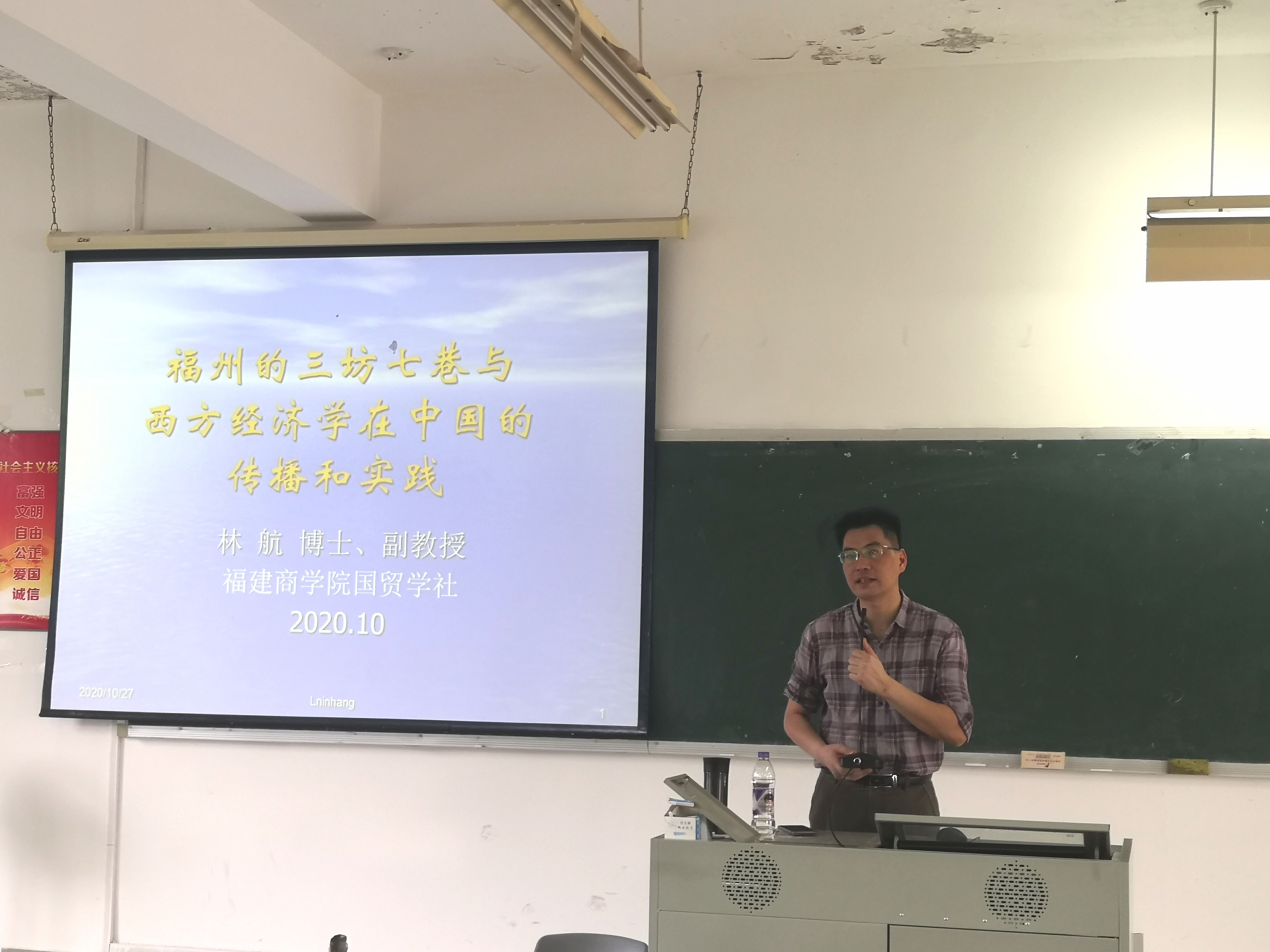 10月27日下午,由beat365中文官方网站beat365中文官方网站国贸学社举办的“beat365中文官方网站博士教师系列讲座”之首期讲座—“福州的三坊七巷与西方经济学在中国的传播与实践”在远志楼T3开展。beat365官网博士林航副教授为主讲人,国贸学生全体社员、相关师生参加讲座。