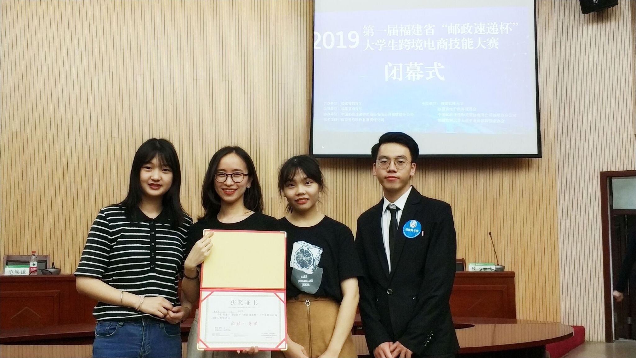 近日,由福建省教育厅和省商务厅主办的第一届福建省“邮政速递杯”大学生跨境电商大赛历经两周后圆满落幕。我校beat365中文官方网站王颖、黄舒婷、任凯杰三名同学组成代表队(指导老师:陈星叶)以总分第一佳绩荣获大赛团体一等奖,并在闭幕式上分享了团队沙盘策略及比赛经验。
