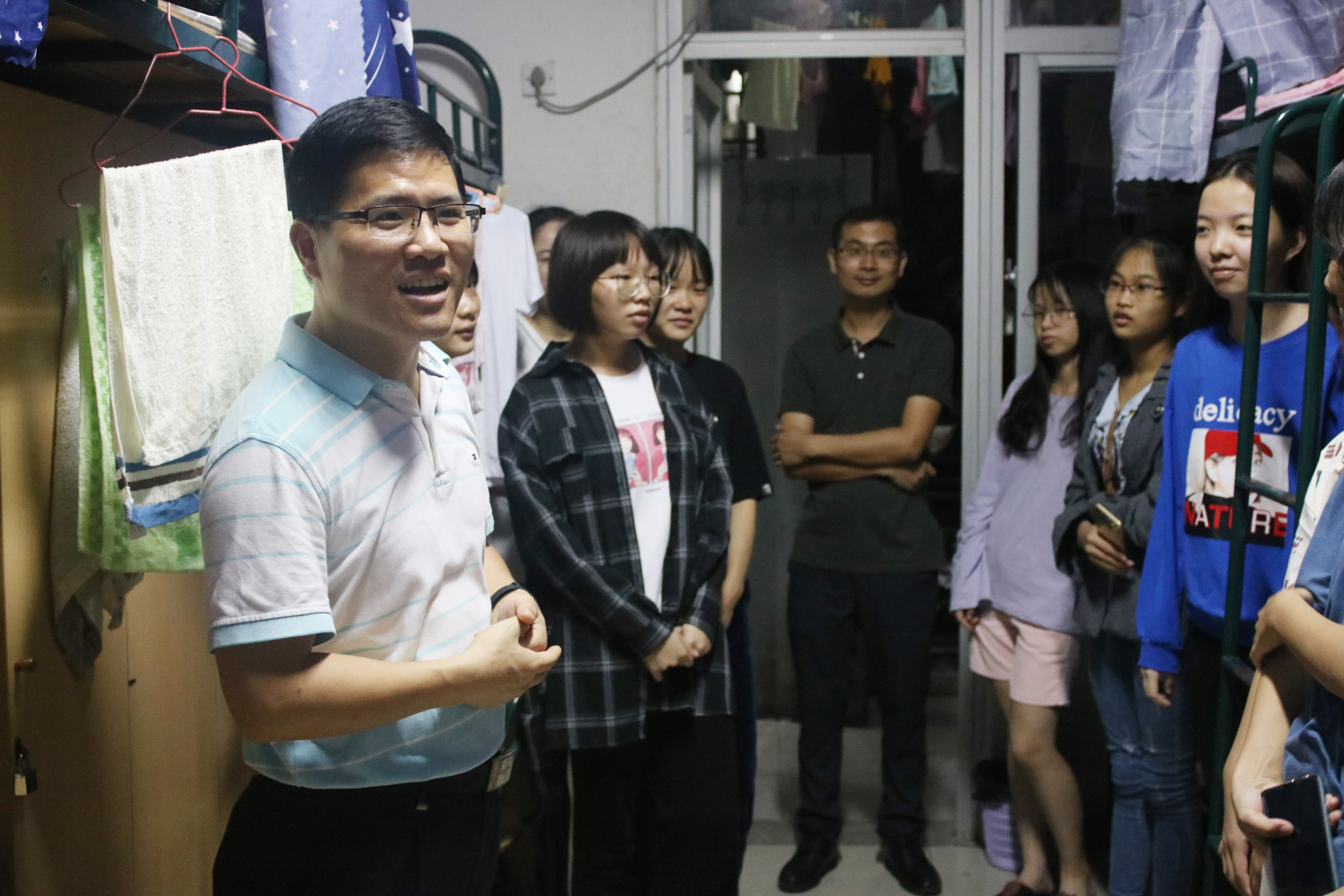 新生入学教育是大学生思想政治教育的重要内容,是根据大学生特点开展的素质教育活动之一,对此,我系高度重视9月8日晚,系主任与蔡斌老师深入系部2018级新生宿舍,亲切询问新生入学情况。系主任与蔡斌老师一同先前往男生新生宿舍,随后走访女生宿舍。系主任仔细询问新生们对校园是否了解、对校园环境是否适应,在系主任和蔡斌老师的亲切询问下,新生们也逐渐从略显拘束转变为踊跃发言,详细介绍各自的入学情况与感想。