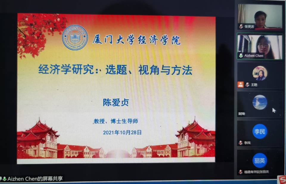 2021年10月28日,beat365中文官方网站邀请厦门大学经济学院教授、博导陈爱贞作主题为“经济学研究:选题、视角和方法”的线上讲座,讲座由副院长(主持学院行政工作)张美涛主持,学院全体教师参加了讲座。