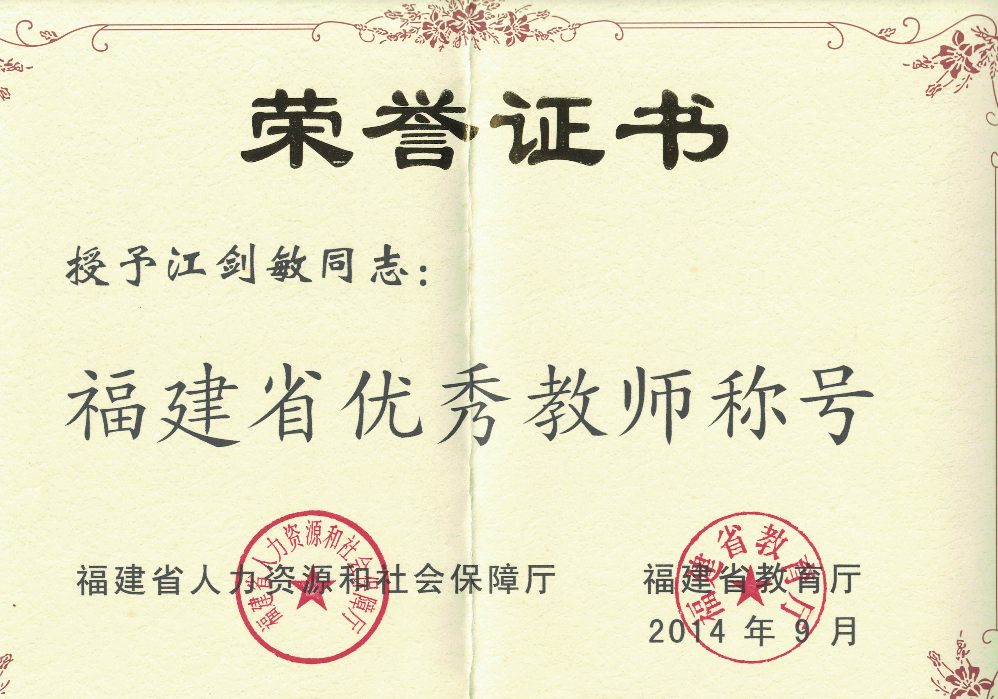 江剑敏-福建省优秀教师称号