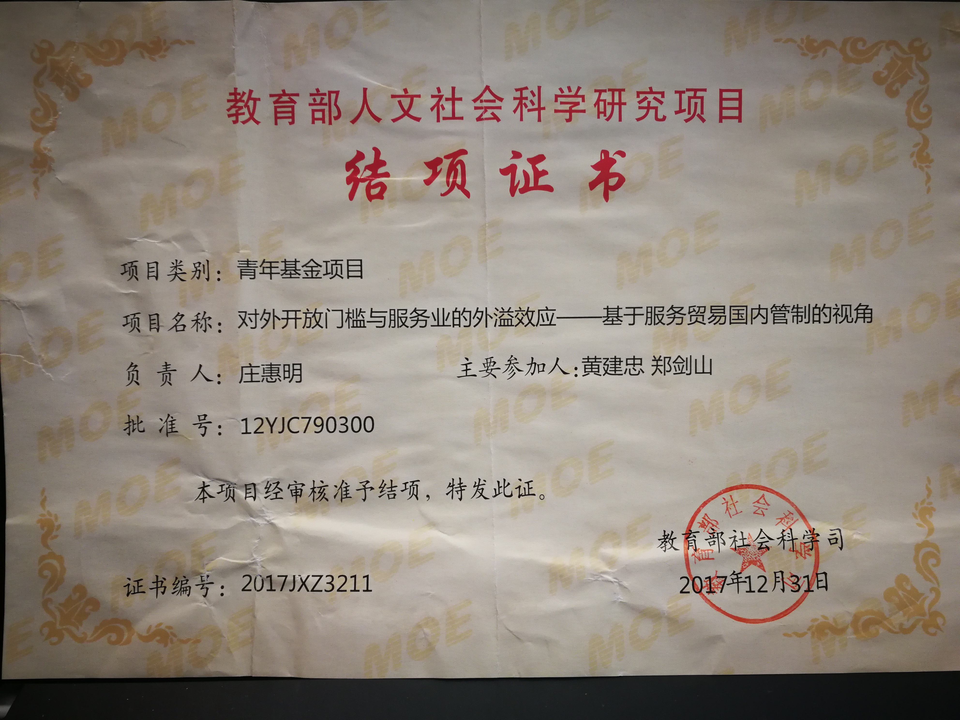 庄惠明-教育部人文社会科学研究项目结项证书